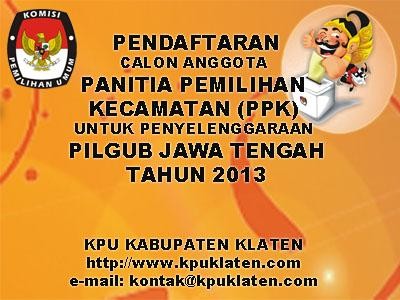 KLATEN – Setelah menyelesaikan tahapan perhitungan, KPU Kabupaten Klaten mengumumkan Data Hasil Pilgub Jateng 2013 yang dihimpun dari Seluruh TPS Tingkat Kabupaten Klaten. Untuk melihat data ini, Anda dapat mengunduhnya pada link berikut ini: