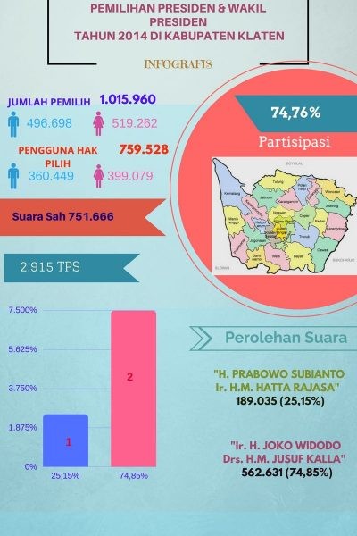 KLATEN – Proses Pemungutan Suara Pemilu Presiden dan Wakil Presiden, Rabu (9/7), di Kabupaten Klaten berjalan lancar. Pihak pemilih di Kabupaten Klaten menggunakan hak pilihnya secara tertib di lokasi tempat pengumutan suara (TPS). Jumlah TPS PPWP untuk Kabupaten Klaten sebanyak 2.915 TPS. Dari pantauan mulai jam 08.00 WIB pagi tadi, masyarakat berbondong-bondong menggunakan hak pilihnya. Di sisi lain, pihak penyelenggara Pemilu mulai dari level KPPS hingga KPU telah siap memberikan layanan kepada masyarakat untuk memberikan hak politiknya. ‘’Dari pantauan dan laporan di seputar wilayah Klaten, semuanya berjalan lancar. Pencoblosan berjalan cepat dan lancar. Tidak ada antrean, karena hanya mencoblos dua pasang calon dan masyarakat sudah berpengalaman dalam menggunakan hak pilihnya,’’ ungkap Ketua KPU Klaten, Siti Farida sembari menyampaikan bahwa pada saat penghitungan suara di TPS juga berlangsung lancar dan tertib.