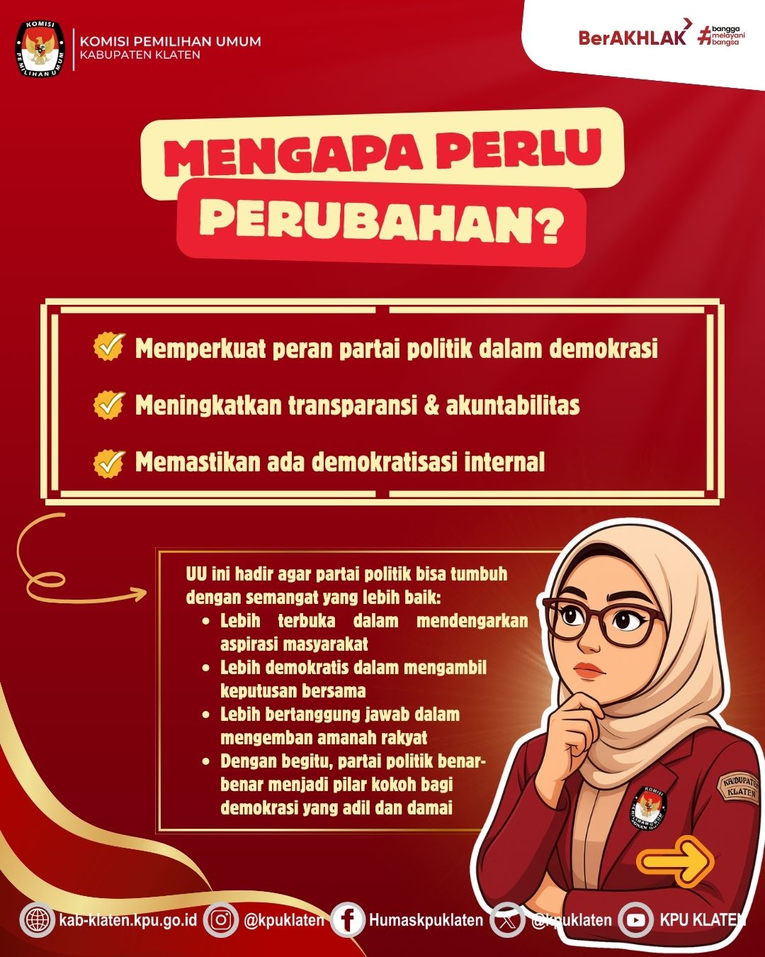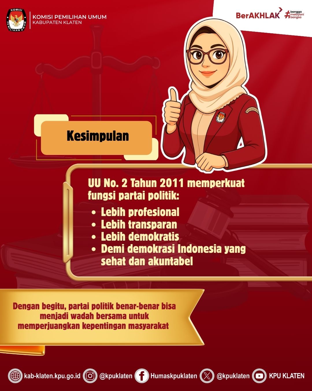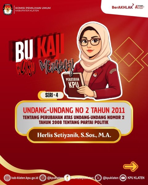 Program BU KAJI menjadi ruang edukasi publik yang konsisten disajikan KPU Klaten setiap Rabu minggu kedua, sebagai wujud komitmen untuk meningkatkan literasi demokrasi masyarakat. Dengan pemahaman yang baik terhadap regulasi kepemiluan, diharapkan partisipasi publik dalam proses demokrasi dapat semakin berkualitas. Simak rangkuman materi selengkapnya di media sosial KPU Kabupaten Klaten.
