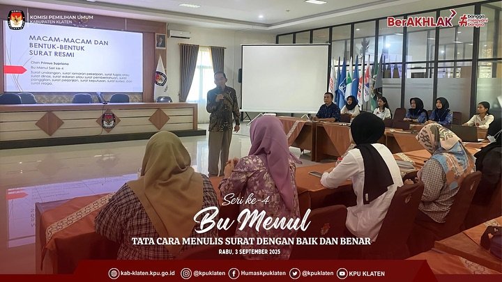 KLATEN – #temanpemilih KPU Kabupaten Klaten kembali menghadirkan program Bu Menul (Rabu Menulis) yang rutin digelar setiap Rabu minggu pertama dan minggu ketiga. Pada seri ke-4 yang berlangsung Rabu (3/9), kegatan kembali menghadirkan narasumber Ketua KPU Klaten, Primus Supriono, dengan materi lanjutan mengenai Tata Cara Penulisan Surat yang Baik dan Benar.