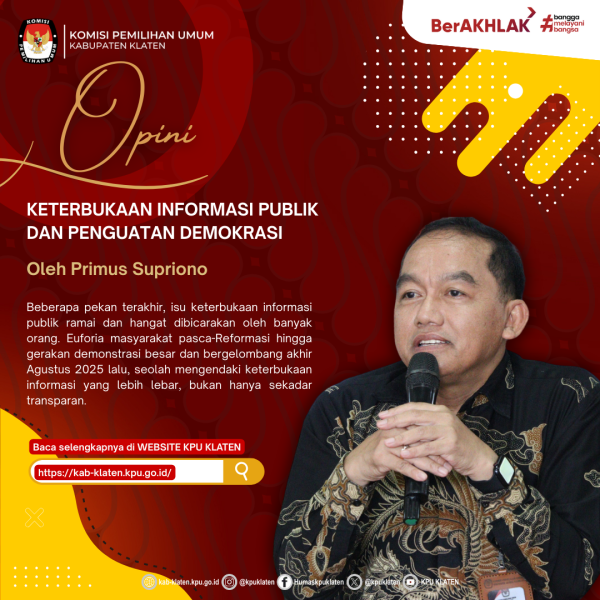 Melalui tulisan ini semoga dapat memberikan sedikit pengetahuan seputar pembicaraan hangat keterbukaan informasi publik yang terjadi dalam beberapa pekan terakhir. Keterbukaan informasi publik hendaklah dikelola dengan bijak. Sebab, informasi publik yang dikelola dengan baik tentu dapat memperkuat sendi demokrasi kita. *** (Primus Supriono, Ketua KPU Kabupaten Klaten).