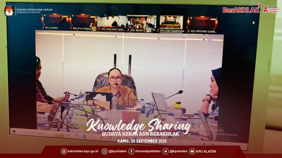 KLATEN - #temanpemilih KPU Kabupaten Klaten turut berpartisipasi dalam kegiatan Knowledge Sharing Budaya Kerja ASN BerAKHLAK yang diselenggarakan oleh Sekretariat Jenderal KPU RI via daring, Kamis (25/9). Kegiatan diikuti oleh Sekretariat KPU Provinsi dan Sekretariat KPU Kabupaten/Kota se-Indonesia.