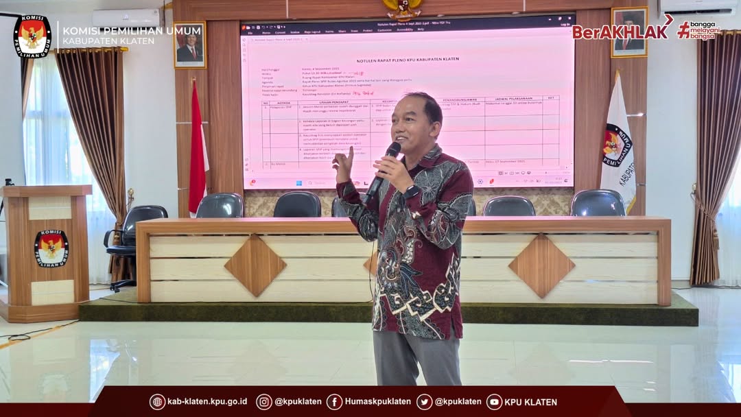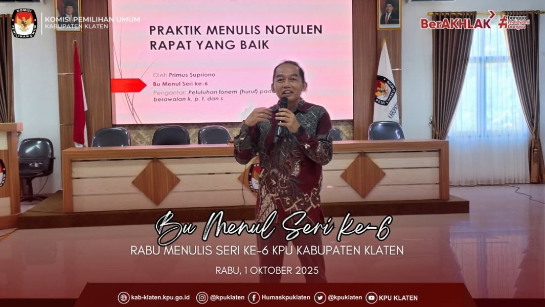 KLATEN – #temanpemilih Segenap pimpinan dan pegawai di lingkungan KPU Kabupaten Klaten kembali mengikuti kegiatan Bu Menul (raBU MenuLIs) pada Rabu (1/10). Pada edisi ke-6 ini, tema yang diangkat adalah “Cara Menulis Notulen Rapat yang Baik (Part 2)” dengan pengantar materi mengenai peluluhan fonem (huruf) pada kata dasar berawalan k, p, t, dan s.