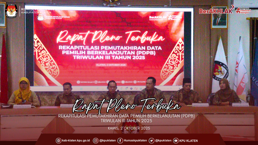 Hai #temanpemilih KPU Kabupaten Klaten menyelenggarakan Rapat Pleno Terbuka Rekapitulasi Pemutakhiran Data Pemilih Berkelanjutan (PDPB) Triwulan III Tahun 2025 bertempat di Aula Kantor KPU Kabupaten Klaten, Kamis (2/10/2025).
