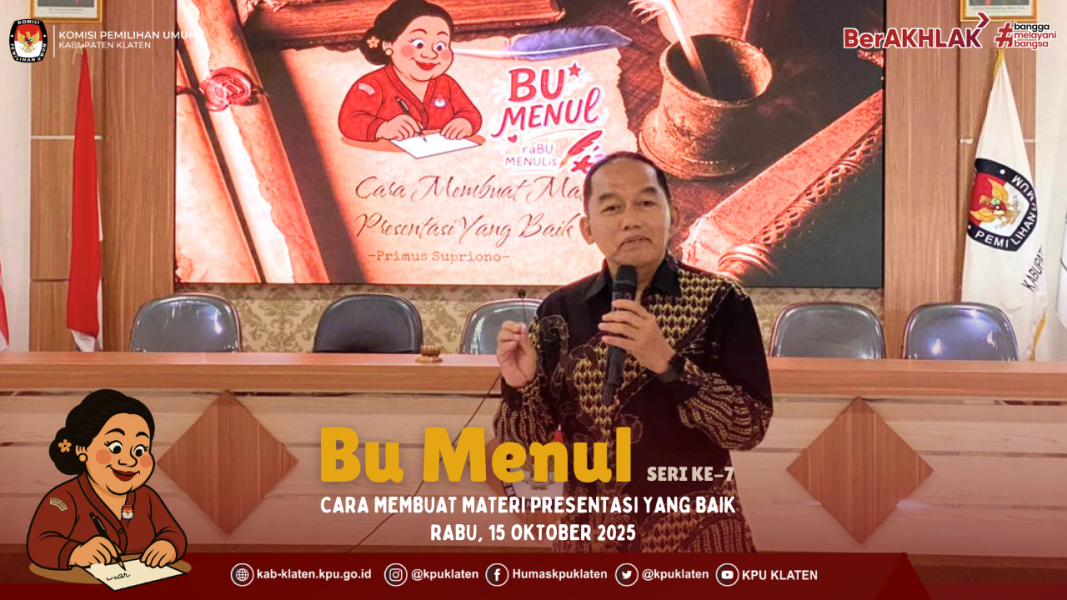 Itulah makna yang diulas dalam Bu Menul Seri 7, kegiatan pembelajaran internal KPU Kabupaten Klaten yang digelar pada Rabu (15/10).