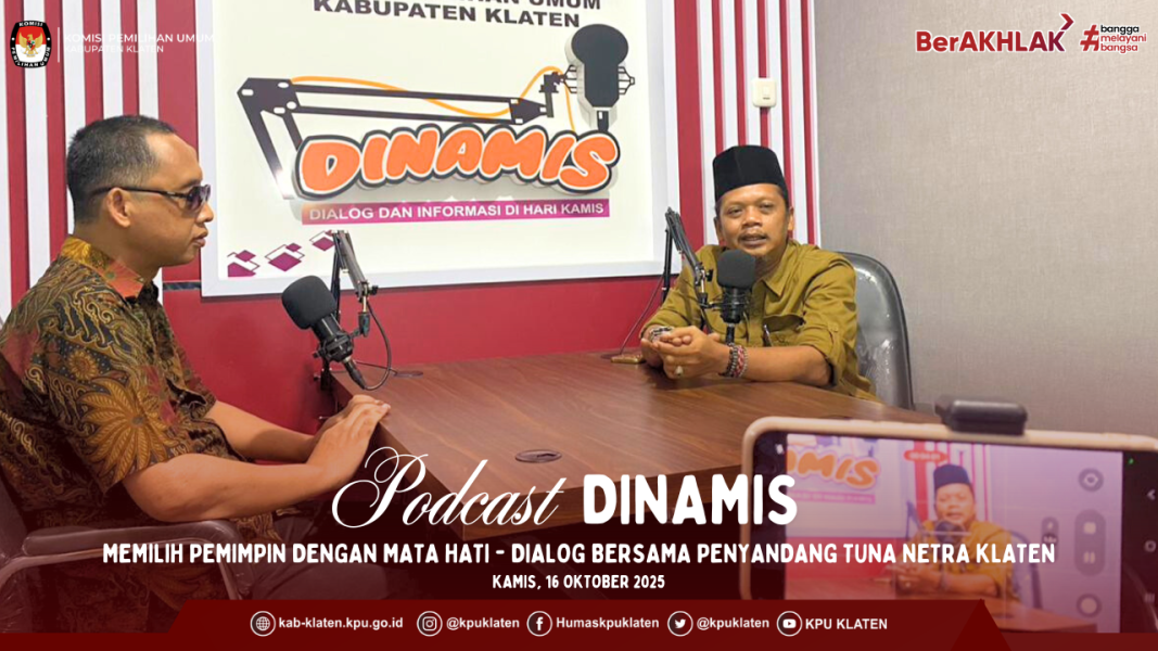 Semua dibahas hangat dalam Podcast DINAMIS (Dialog dan Informasi di Hari Kamis), dengan menghadirkan narasumber Novianto Budi Raharjo, ST. yang merupakan Ketua DPC Pertuni (Persatuan Tuna Netra) Cabang Klaten, dan host Ketua Divisi Sosialisasi, Pendidikan Pemilih , Partisipasi Masyarakat dan SDM KPU Klaten, Muhammad Ansori, S.Pd.I.