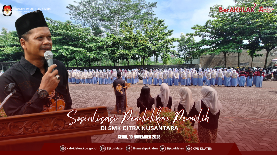 Hai #TemanPemilih Klaten - KPU Kabupaten Klaten hadir di SMK Citra Nusantara Klaten untuk memberikan sosialisasi pendidikan pemilih kepada para siswa-siswi sekaligus melakukan pendampingan dalam proses pelaksanaan pemilihan Ketua OSIS SMK Citra Nusantara Klaten, Senin (10/11/2025).