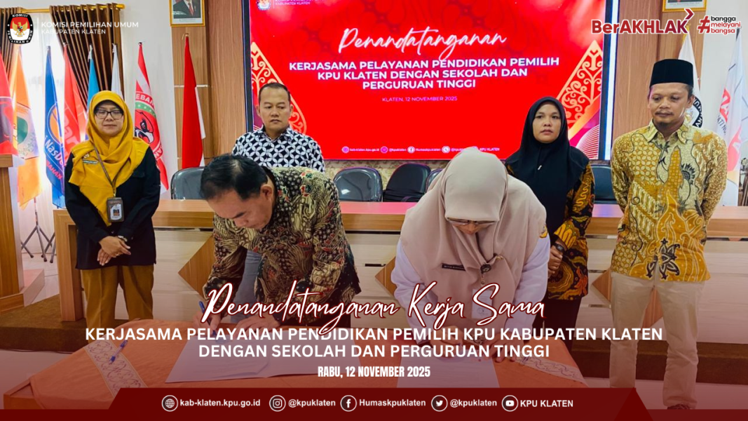Hai #TemanPemilih KPU Kabupaten Klaten melaksanakan Penandatanganan Kerjasama Pelayanan Pendidikan Pemilih bersama sekolah dan perguruan tinggi se-Kabupaten Klaten. Kegiatan ini menjadi langkah strategis dalam memperluas jangkauan pendidikan pemilih serta menumbuhkan kesadaran politik di kalangan pelajar dan mahasiswa, Rabu (12/11/2025).