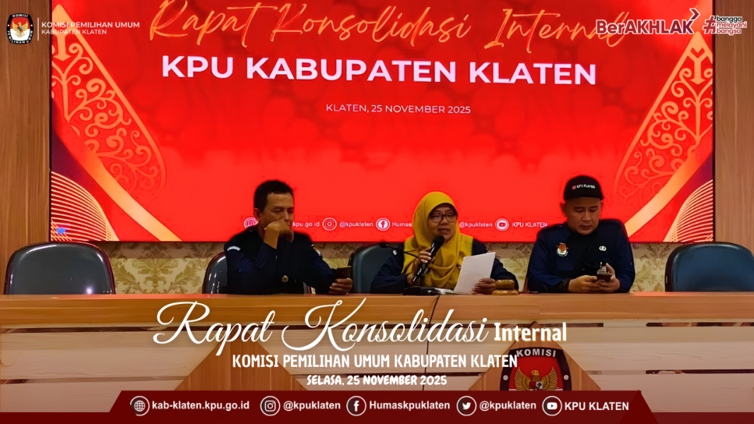 KLATEN - #temanpemilih KPU Klaten menggelar rapat konsolidasi internal pada Selasa (25/11). Rapat dipimpin oleh Sekretaris KPU Klaten dan diikuti oleh para Kepala Subbagian beserta seluruh pegawai sekretariat. Dalam rapat tersebut, Sekretaris memimpin penyelarasan agenda kerja antar-subbag untuk memastikan seluruh program berjalan dengan arah yang sama. Masing-masing kasubag memaparkan perkembangan kegiatan, menyampaikan kebutuhan dukungan, serta melaporkan hasil evaluasi dari agenda yang telah dilaksanakan pada minggu sebelumnya.