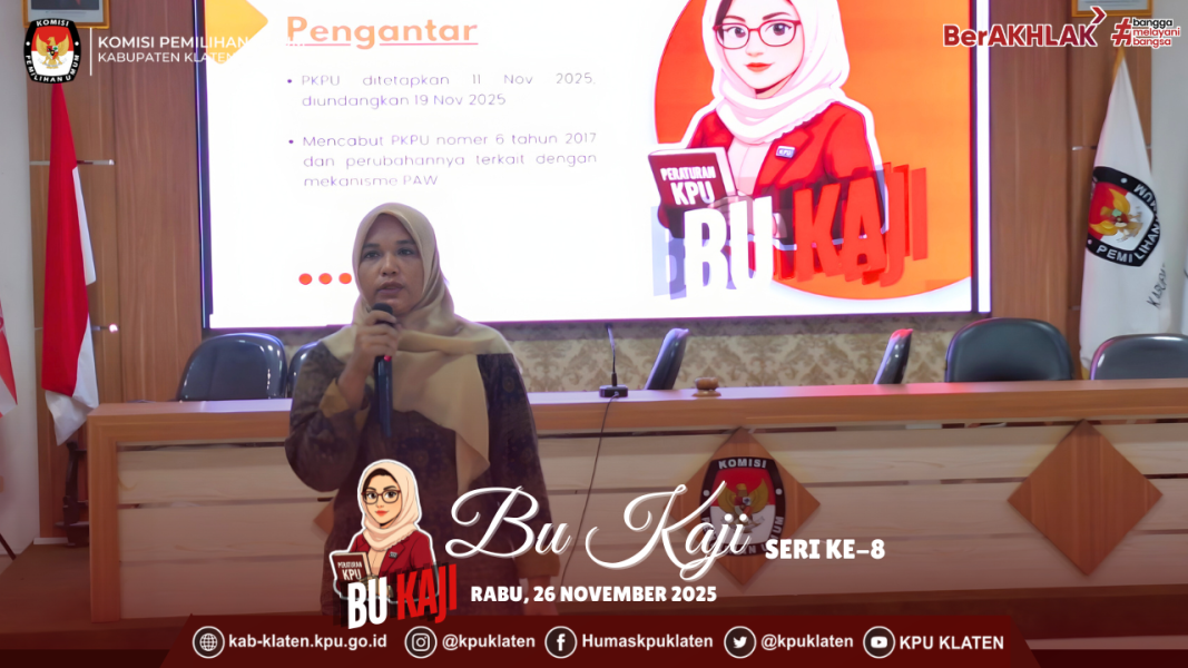 KLATEN — #temanpemilih Segenap pimpinan dan pelaksana, serta siswa siswi magang di lingkungan KPU Kabupaten Klaten mengikuti kegiatan Bu Kaji Seri ke-8 yang menghadirkan Herlis Setiyanik, Ketua Divisi Teknis Penyelenggaraan, sebagai narasumber. Pada sesi ini, Herlis mengupas pokok-pokok PKPU Nomor 3 Tahun 2025 mengenai Penggantian Antarwaktu (PAW) Anggota DPRD.