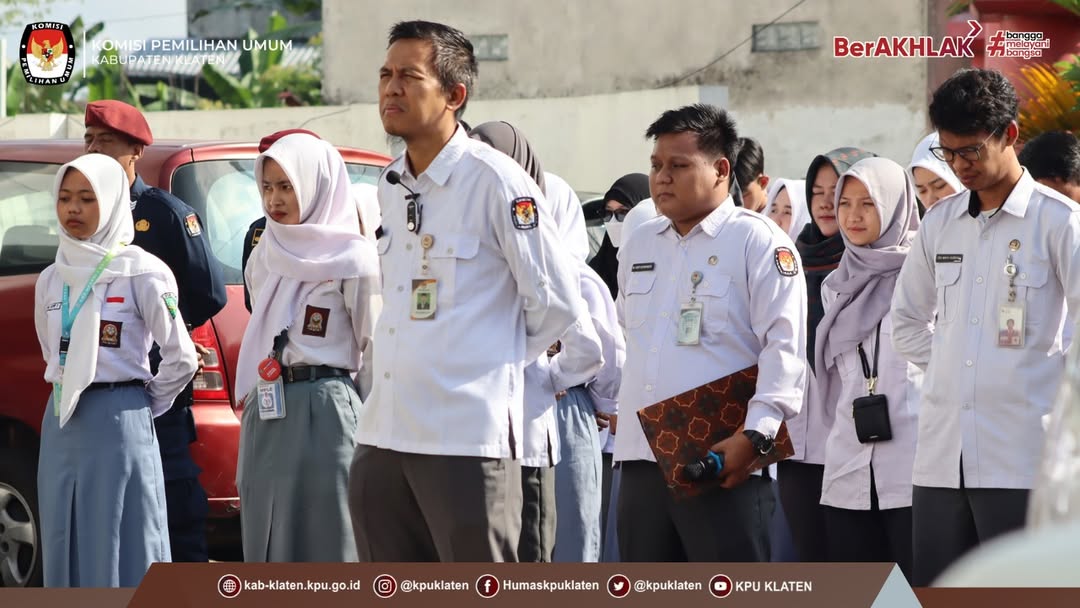 KLATEN – #temanpemilih KPU Klaten kembali melaksanakan apel pagi, Senin (2/2/2026). Kegiatan yang digelar di halaman Kantor KPU Klaten tersebut menghadirkan Muhammad Ansori (Ketua Divisi Sosialisasi, Pendidikan Pemilih, Partisipasi Masyarakat, dan SDM) selaku pembina apel, serta diikuti oleh seluruh komisioner, sekretaris, jajaran sekretariat KPU Kabupaten Klaten, mahasiswa magang, dan pelajar yang tengah melaksanakan praktik kerja lapangan (PKL).