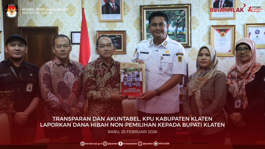 KLATEN – Komisi Pemilihan Umum (KPU) Kabupaten Klaten menyampaikan laporan penggunaan dana hibah non-pemilihan kepada Bupati Klaten pada Rabu (25/2/2026). Kegiatan ini merupakan bentuk komitmen transparansi dan akuntabilitas dalam pengelolaan anggaran yang telah dipercayakan kepada KPU.