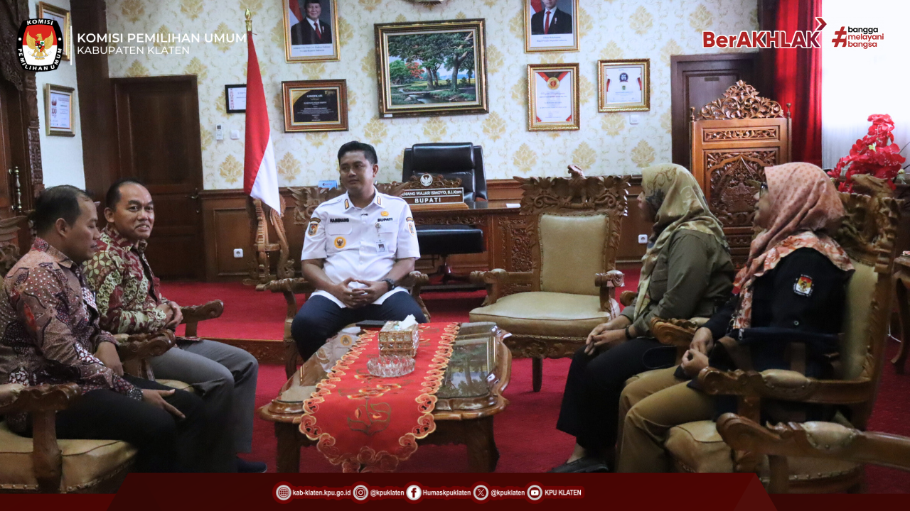 Rombongan KPU Kabupaten Klaten yang dipimpin Ketua Primus Supriono hadir bersama para anggota serta Sekretaris KPU Kabupaten Klaten untuk menyampaikan laporan secara langsung kepada Hamenang Wajar Ismoyo.