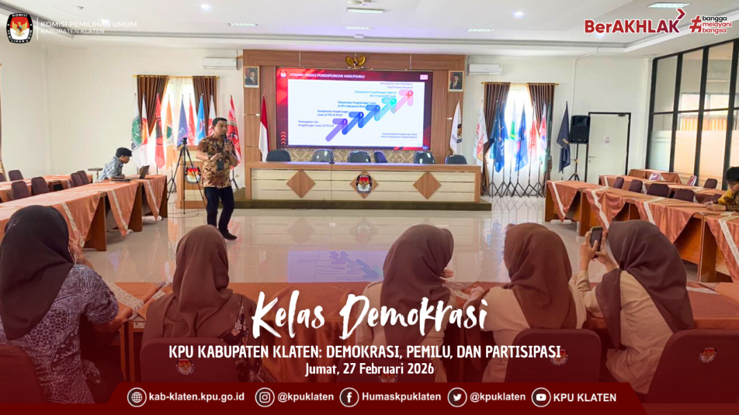 KLATEN - #temanpemilih KPU Kabupaten Klaten menggelar Kelas Demokrasi dengan tema Demokrasi, Pemilu, dan Partisipasi, Jumat (27/2). Kegiatan ini diikuti oleh seluruh siswa-siswi yang melaksanakan praktik kerja lapangan (PKL) di lingkungan KPU Klaten.