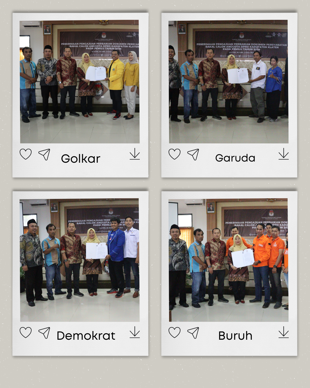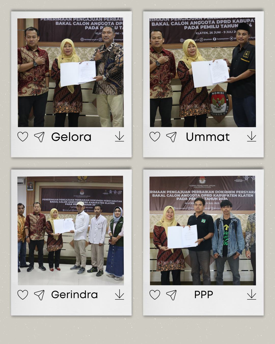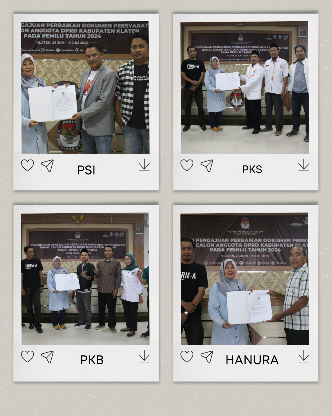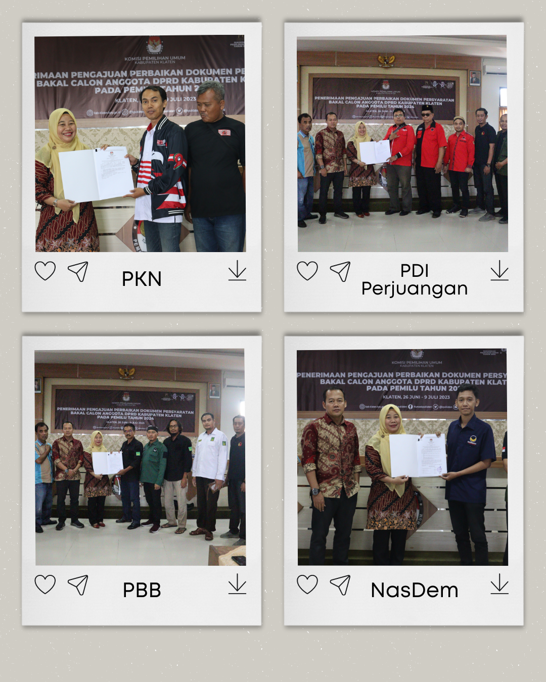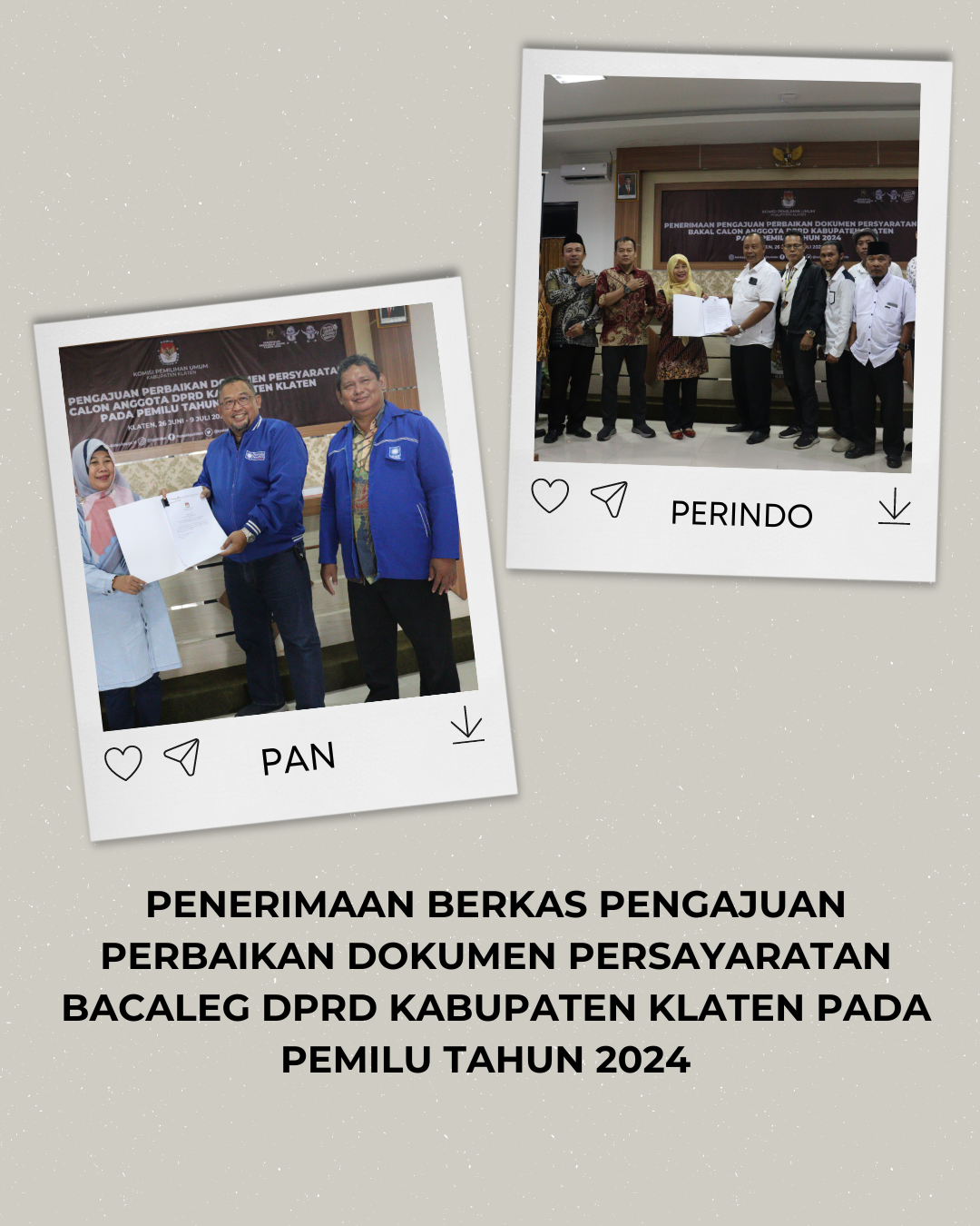 KPU Kabupaten Klaten telah menerima pengajuan perbaikan dokumen persyaratan Bakal Calon Anggota DPRD Kabupaten Klaten untuk Pemilu 2024 lengkap dari 18 Partai Politik.