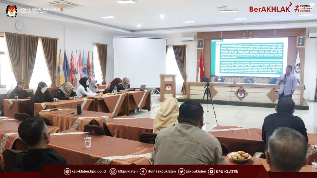 KLATEN – #temanpemilih Setelah resmi diluncurkan pada Rabu (23/7), program “BU KAJI: Rabu Mengkaji” langsung menggelar seri perdana yang diikuti oleh seluruh pimpinan dan pegawai KPU Kabupaten Klaten. Dalam seri pertama ini, Divisi Hukum dan Pengawasan KPU Klaten, Samsul Huda, menjadi narasumber dengan membawakan topik “Putusan Mahkamah Konstitusi Nomor 135/PUU-XXII/2025 tentang Pemisahan Pemilu Nasional dan Pemilu Daerah.”