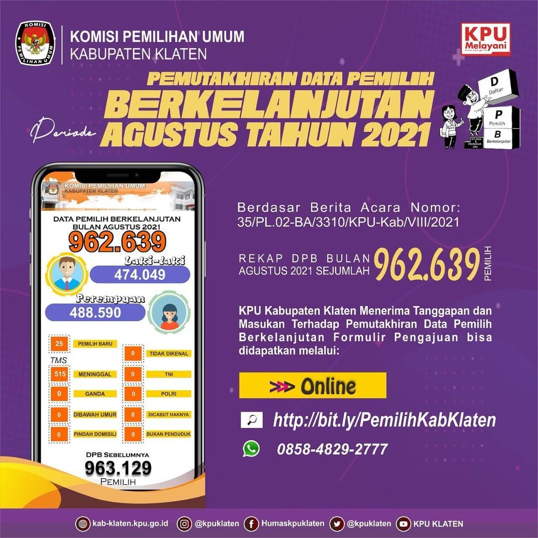 Klaten – Komisi Pemilihan Umum (KPU) Kabupaten Klaten menyelenggarakan kegiatan pemutakhiran Data Pemilih Berkelanjutan Tahun 2021 Periode Bulan Agustus (30/8).