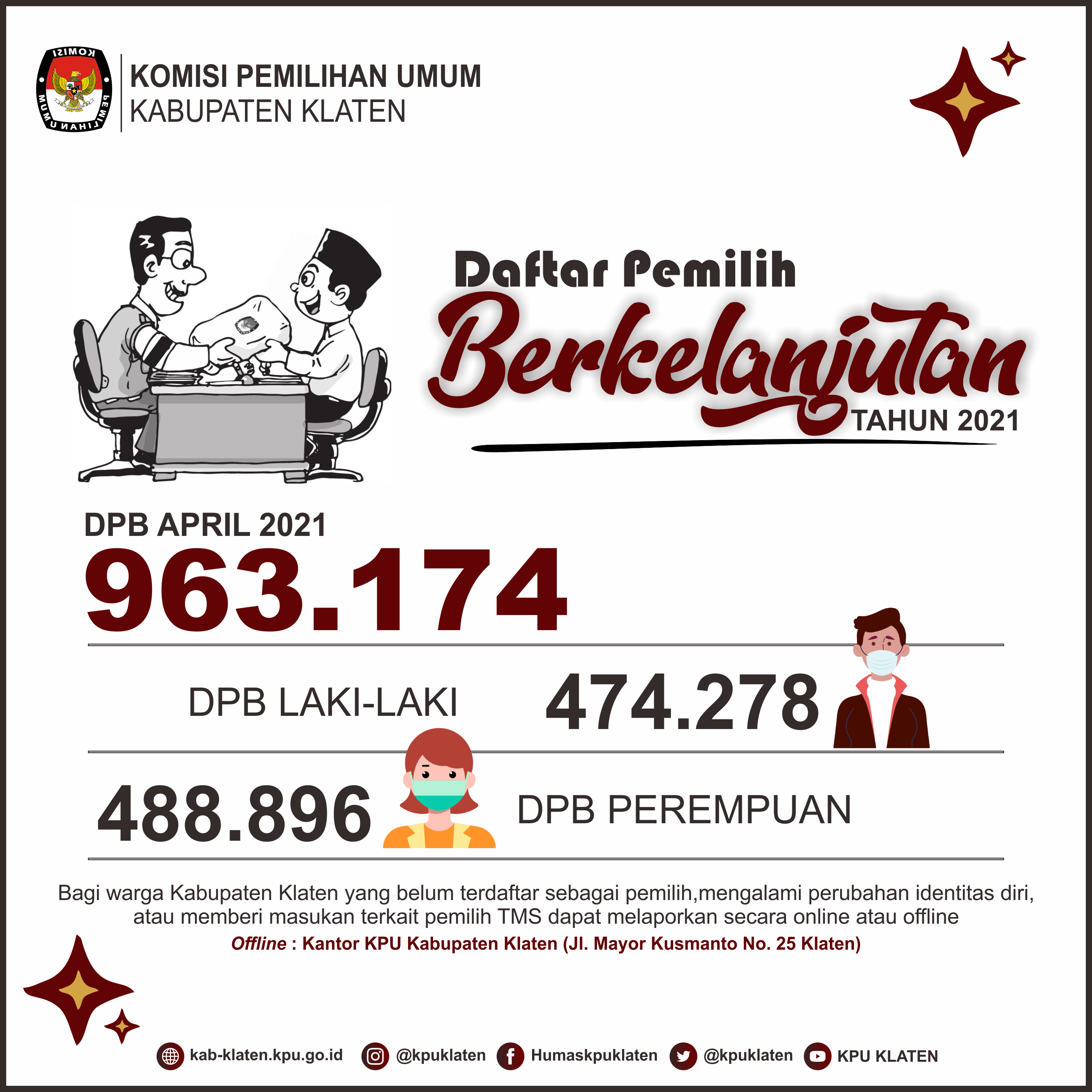Berdasarkan ketentuaan Surat Edaran Ketua KPU RI Nomor 366/PL.02-SD/01/KPU/IV/2021 Tanggal 21 April 2021 tentang Perubahan Surat Plt Ketua KPU RI Nomor: 132/PL.02-SD/01/KPU/II/2021 perihal Pemutakhiran Data Pemilih Berkelanjutan Tahun 2021 Komisi Pemilihan Umum Kabupaten Klaten melakukan Rekapitulasi Daftar Pemilih Berkelanjutan dengan jumlah sebanyak 963.174 (Sembilan Ratus Enam Puluh Tiga Ribu Seratus Tujuh Puluh Empat) dengan rincian pemilih laki-laki berjumlah 474.278 (Empat Ratus Tujuh Puluh Empat Ribu Dua Ratus Tujuh Puluh Delapan) pemilih dan pemilih perempuan berjumlah 488.896 (Empat Ratus Delapan Puluh Delapan Ribu Delapan Ratus Sembilan Puluh Enam) pemilih, tersebar di 26 (Dua Puluh Enam) Kecamatan sesuai dengan rincian sebagaimana terlampir [DOWNLOAD]