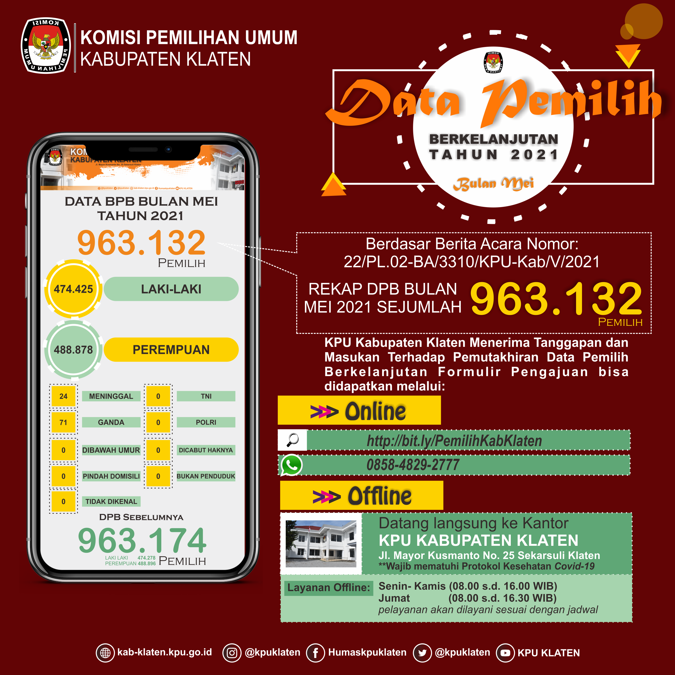Berdasarkan ketentuaan Surat Edaran Ketua KPU RI Nomor 366/PL.02-SD/01/KPU/IV/2021 Tanggal 21 April 2021 tentang Perubahan Surat Plt Ketua KPU RI Nomor: 132/PL.02-SD/01/KPU/II/2021 perihal Pemutakhiran Data Pemilih Berkelanjutan Tahun 2021 Komisi Pemilihan Umum Kabupaten Klaten melakukan Rekapitulasi Daftar Pemilih Berkelanjutan dengan jumlah sebanyak 963.132 (Sembilan Ratus Enam Puluh Tiga Ribu Seratus Tiga Puluh Dua) dengan rincian pemilih laki-laki berjumlah 474.254 (Empat Ratus Tujuh Puluh Empat Ribu Dua Ratus Lima Puluh Empat) pemilih dan pemilih perempuan berjumlah 488.878 (Empat Ratus Delapan Puluh Delapan Ribu Delapan Ratus Tujuh Puluh Delapan) pemilih, tersebar di 26 (Dua Puluh Enam) Kecamatan sesuai dengan rincian sebagaimana terlampir [DOWNLOAD]