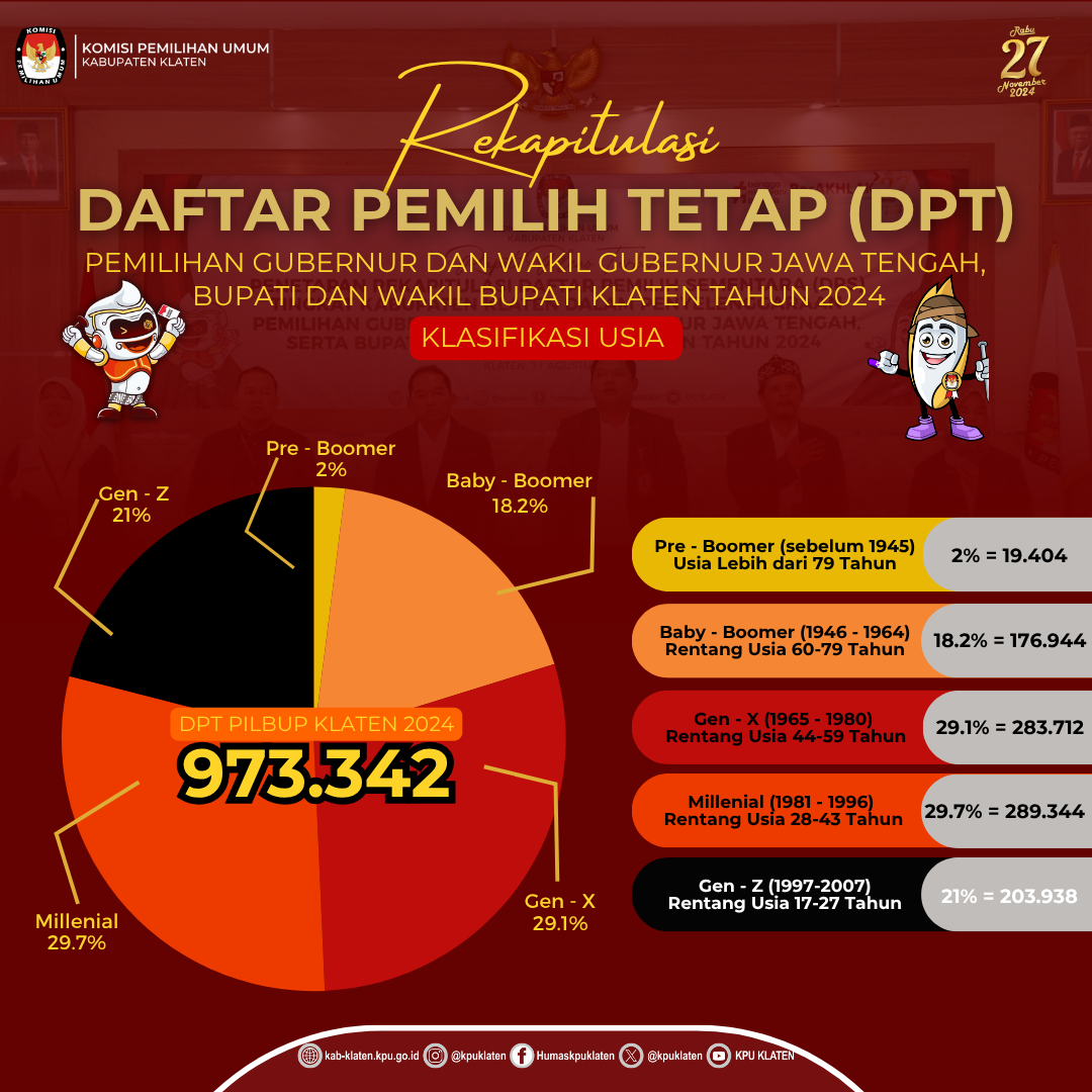 Bila kita menilik data KPU Jawa Tengah, terdapat lebih dari 52% pemilih Pemilu 2024 di Jawa Tengah berada pada rentang usia 17–39 tahun. Sementara itu di Kabupaten Klaten, dengan total DPT Pilkada 2024 mencapai 973.342 pemilih, ternyata didominasi oleh dua generasi, yaitu Generasi Milenial dan Generasi X. Berdasarkan data olahan KPU Klaten generasi milenial yang lahir antara tahun 1981 hingga 1996, menempati posisi teratas sebesar 29,7% dari total pemilih. Ini menunjukkan bahwa hampir 3 dari 10 pemilih berasal dari kelompok usia 28 hingga 43 tahun. Tak jauh di belakang, generasi X (usia 44–59 tahun) menyumbang 29,1%, pemilih dari kelompok yang stabil dan matang secara politik. Sementara itu, generasi Z, yang merupakan pemilih muda usia 17-27 tahun, tercatat sejumlah 203.938 orang, atau sekitar 21% dari seluruh pemilih. Ini menjadi sinyal penting, bahwa suara anak muda bukan lagi pelengkap, tetapi bisa menjadi penentu. Sebaliknya, generasi yang lebih tua seperti Baby Boomer (60–79 tahun) dan Pre-Boomer (di atas 79 tahun) masing-masing mencatatkan 18,2% dan 2%. Meski secara jumlah lebih kecil, kontribusi mereka tetap penting, terutama dalam stabilitas dan kesinambungan demokrasi.