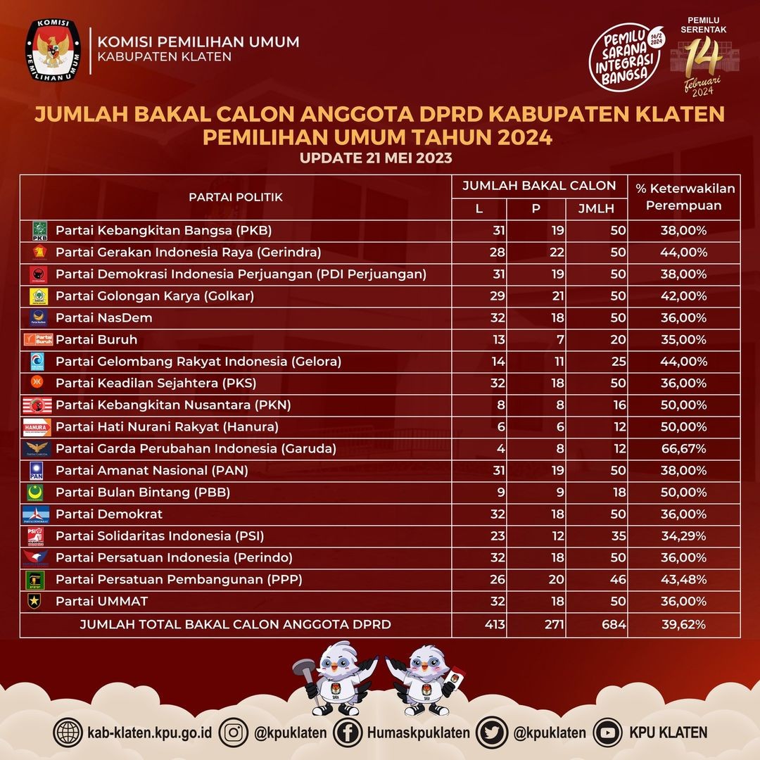 #TemanPemilih berdasarkan Surat Ketua KPU RI Nomor 505/PL.01.4-SD/05/2023 . berikut info grafis Jumlah Bakal Calon Anggota DPRD Kabupaten Klaten Pemilihan Umum Tahun 2024 update 21 Mei 2023.