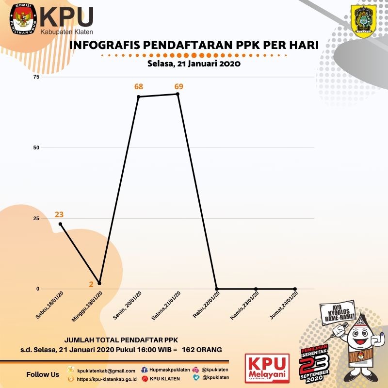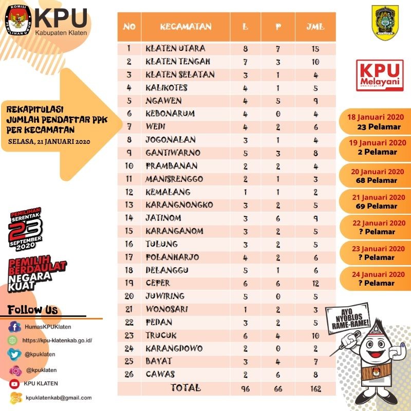 KLATEN – Infografis dan Rekapitulasi jumlah pendaftar PPK Pemilihan Bupati dan Wakil Bupati Klaten 2020 sampai dengan hari ke-4, Selasa (21/1) pukul 16:00 WIB. Jumlah pendaftar pada hari ini adalah sebanyak 69 orang. Jumlah keseluruhan pendaftar sampai dengan hari ini adalah sebanyak 162 orang.