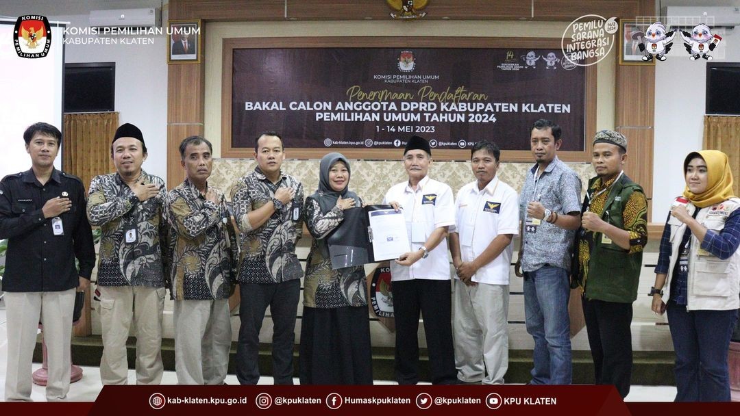 #TemanPemilih (14/05) KPU Kabupaten Klaten menerima pengajuan Bakal Calon Anggota DPRD Partai Garuda Kabupaten Klaten dalam Pemilu Tahun 2024 di Kantor KPU Kabupaten Klaten. Pengajuan dilakukan oleh Ketua Partai Garuda Kabupaten Klaten beserta TIM dan Bakal Calon dari Partai Garuda.