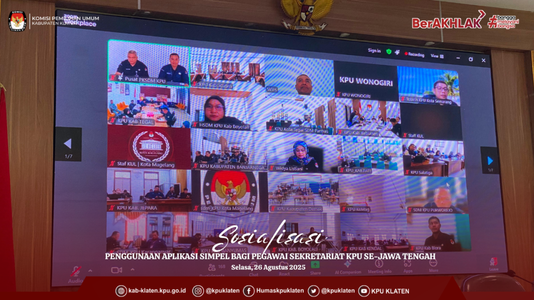 KLATEN – #temanpemilih Sekretariat KPU Kabupaten Klaten mengikuti Sosialisasi Penggunaan Aplikasi SIMPEL (Sistem Informasi Manajemen Pelatihan) yang diselenggarakan KPU Provinsi Jawa Tengah secara daring melalui Zoom Meeting, Selasa (26/8/2025).