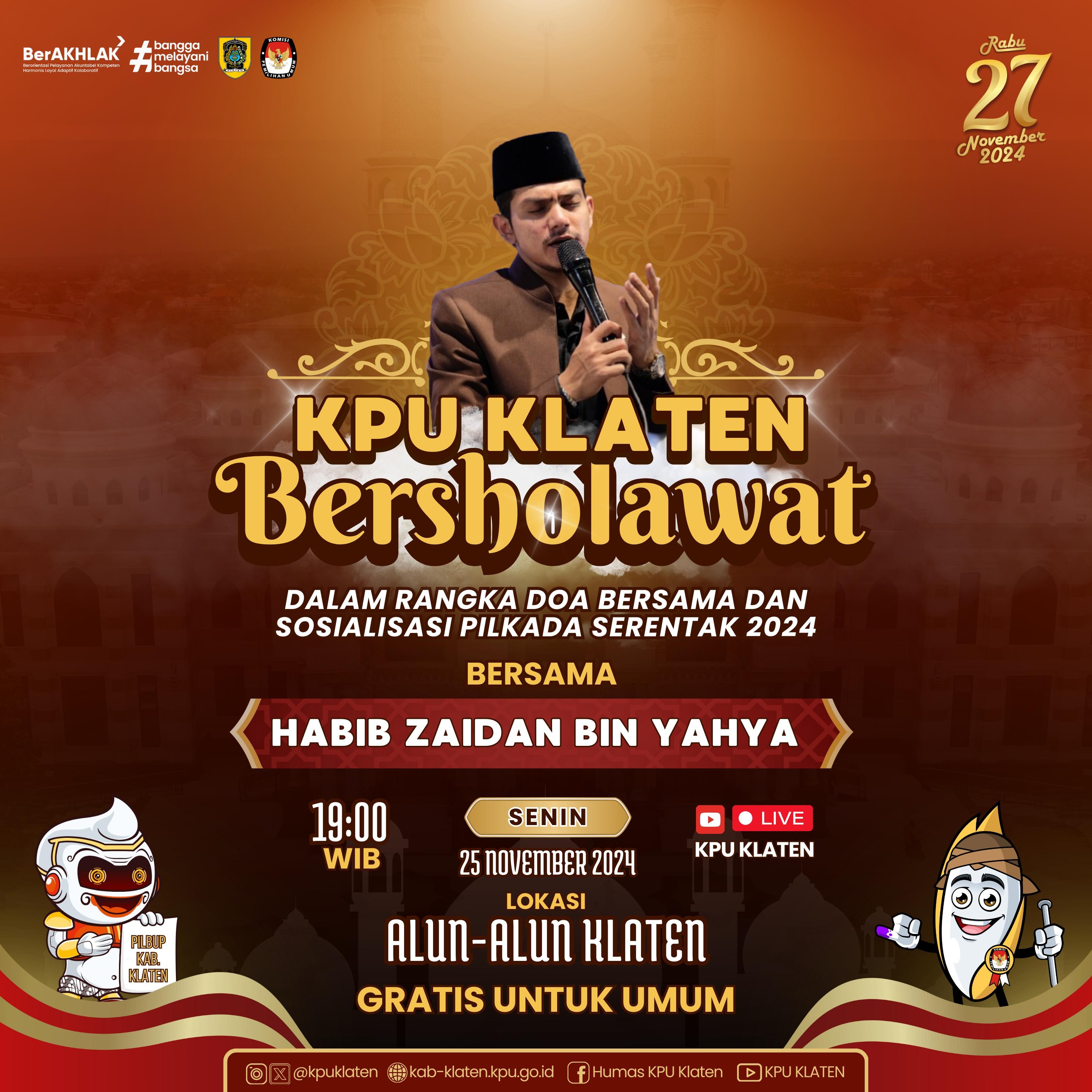 Hari ini, Senin 25 November 2025 KPU Kabupaten Klaten akan menyelenggarakan kegiatan Doa Bersama yang akan menghadirkan Habib Zaidan Bin Yahya dari Pekalongan.