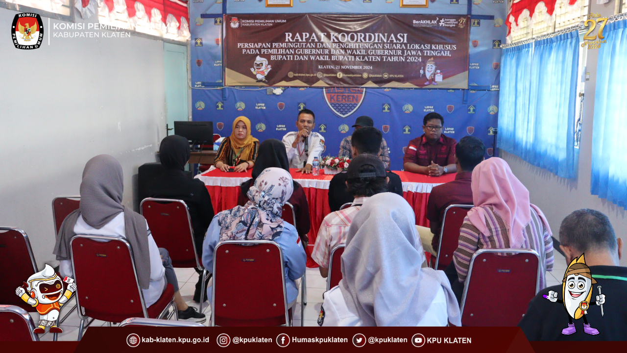 #TemanPemilih Klaten - Komisi Pemilihan Umum Kabupaten Klaten selenggarakan Rapat Koordinasi Persiapan dan Pemungutan Suara di Lokasi Khusus pada Pemilihan Gubernur dan Wakil Gubernur Jawa Tengah, serta Bupati dan Wakil Bupati Klaten Tahun 2024, Kamis (21/11).