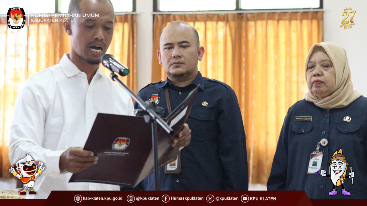 #TemanPemilih Klaten - Komisi Pemilihan Umum Kabupaten Klaten melantik Pengganti Antar Waktu (PAW) Panitia Pemungutan Suara (PPS) Desa Rejoso Kecamatan Jogonalan bertamapat di Aula KPU Kabupaten Klaten, Selasa (13/08/2024).