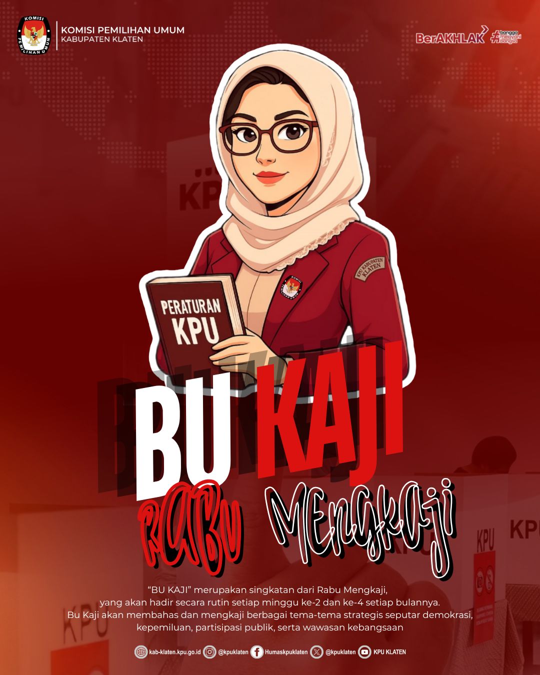 “BU KAJI” merupakan singkatan dari Rabu Mengkaji, yang akan hadir secara rutin setiap minggu ke-2 dan ke-4 setiap bulannya. Program ini akan mengangkat berbagai topik menarik seputar demokrasi, kepemiluan, isu politik terkini, serta dinamika kelembagaan yang relevan dengan tugas dan fungsi penyelenggara pemilu.