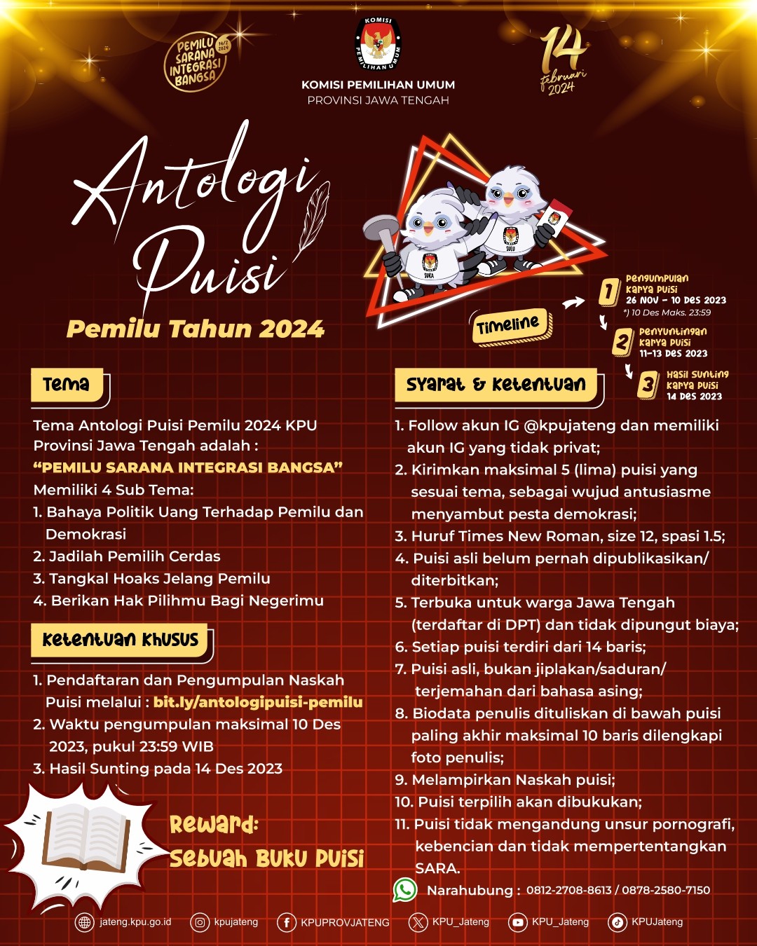 LOMBA DAN ANTOLOGI PUISI Selasa, 28 November 2023 17:00 73 FILE POSTER DAPAT DIUNDUH DI SINI Bagikan: Telah dilihat 73 kali
