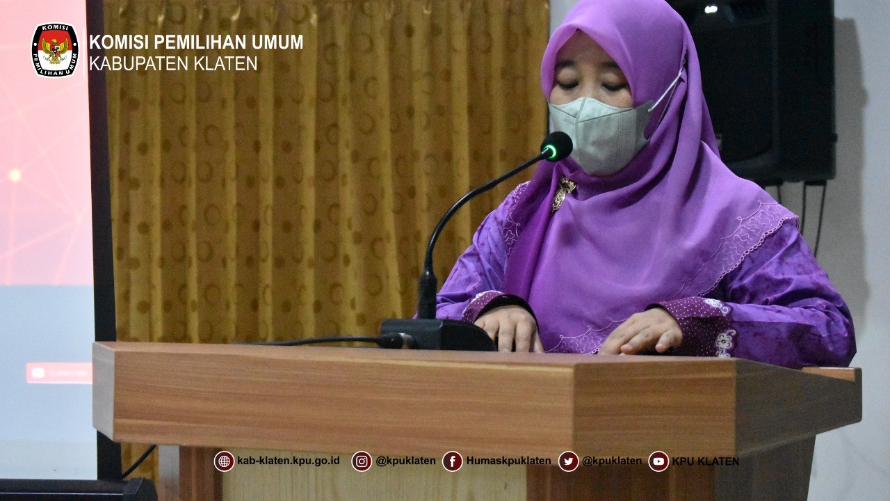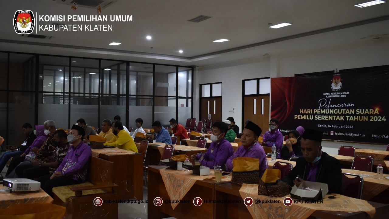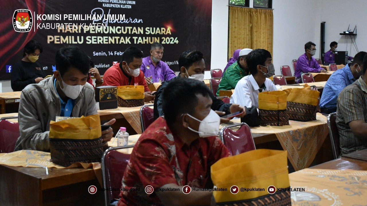 Klaten - Senin (14/2) Komisi Pemilihan Umum Kabupaten Klaten Mengikuti Kegiatan Nonton bersama Peluncuran Hari Pemungutan Suara Pemilu 2024, mengundang Forkopimda, Instansi Terskait dan Partai Politik. Kegiatan Nonton bersama Peluncuran Hari Pemungutan Suara Pemilu 2024 dilaksanakan di Aula KPU Kabupaten Klaten.