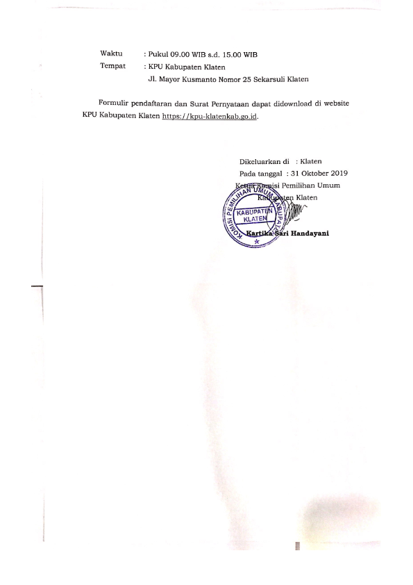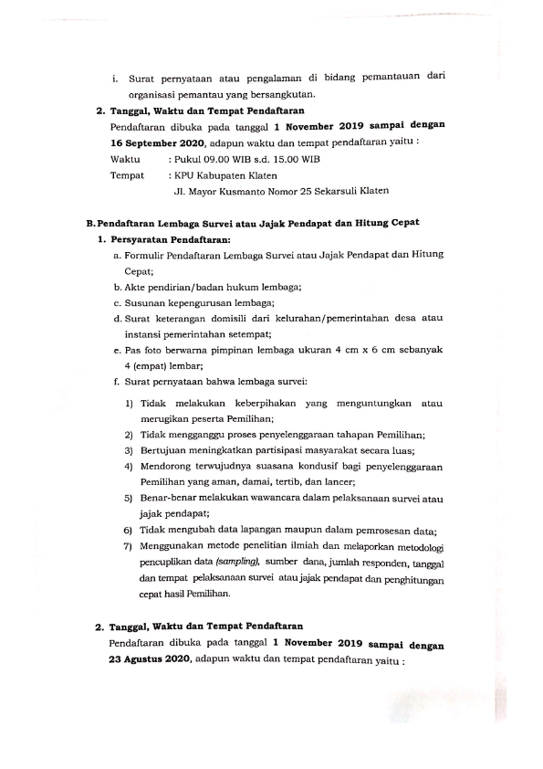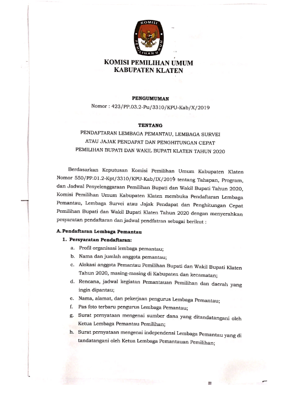 PENDAFTARAN LEMBAGA PEMANTAU, LEMBAGA SURVEI/JAJAK PENDAPAT & PENGHITUNGAN CEPAT Jumat, 01 November 2019 00:00 32 Formulir Pendaftaran Pemantau Dalam Negeri, dapat diunduh [disini] Formulir Pendaftaran dan Surat Pernyataan Lembaga Survei [disini] Bagikan: Telah dilihat 32 kali