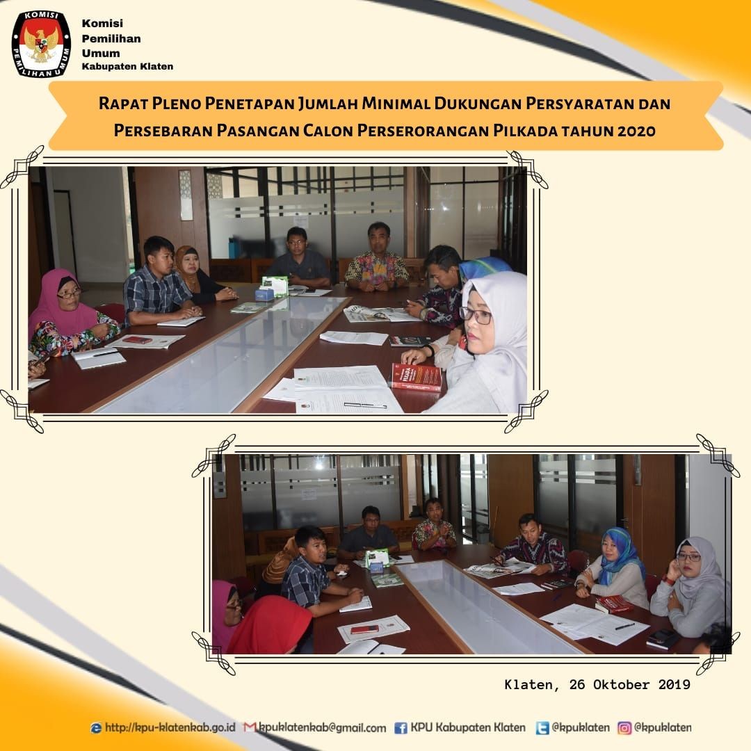 KLATEN – KPU Kabupaten Klaten menggelar Rapat Pleno Penetapan Jumlah Minimal Dukungan Persyaratan dan Persebaran Pasangan Calon Perserorangan Pilkada tahun 2020, Sabtu (26/10). Hasil rapat pleno tertuang dalam Keputusan Komisi Pemilihan Umum Kabupaten Klaten Nomor : 556/Pl.02.1-Kpt/3310/KPU-Kab/X/2019 Tentang Penetapan Jumlah Minimal Dukungan Persyaratan dan Persebaran Pasangan Calon Perseorangan Dalam Pemilihan Bupati dan Wakil Bupati Klaten Tahun 2020. Keputusan tersebut menetapkan Rekapitulasi Daftar Pemilih Tetap (DPT) Pemilihan Umum Tahun 2019 sebagai dasar Penghitungan Syarat Dukungan Pasangan Calon Perseorangan dalam Pemilihan Bupati dan Wakil Bupati Klaten Tahun 2020 sebagaimana tercantum dalam Lampiran I, dan menetapkan Jumlah Minimal Dukungan Persyaratan dan Persebaran Pasangan Calon Perseorangan dalam Pemilihan Bupati dan Wakil Bupati Klaten Tahun 2020 sebagaimana tercantum dalam Lampiran II.