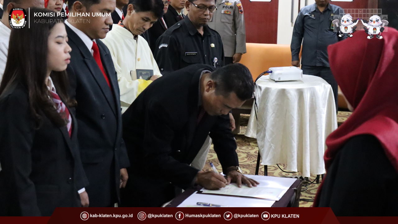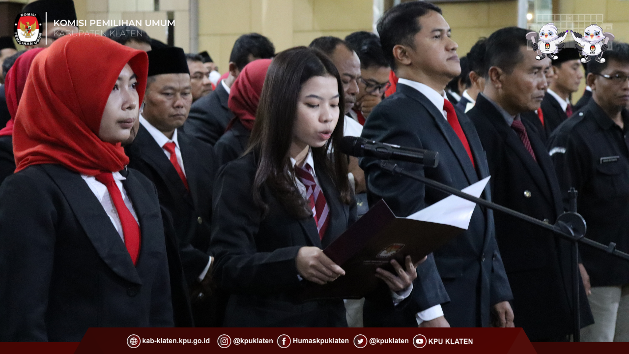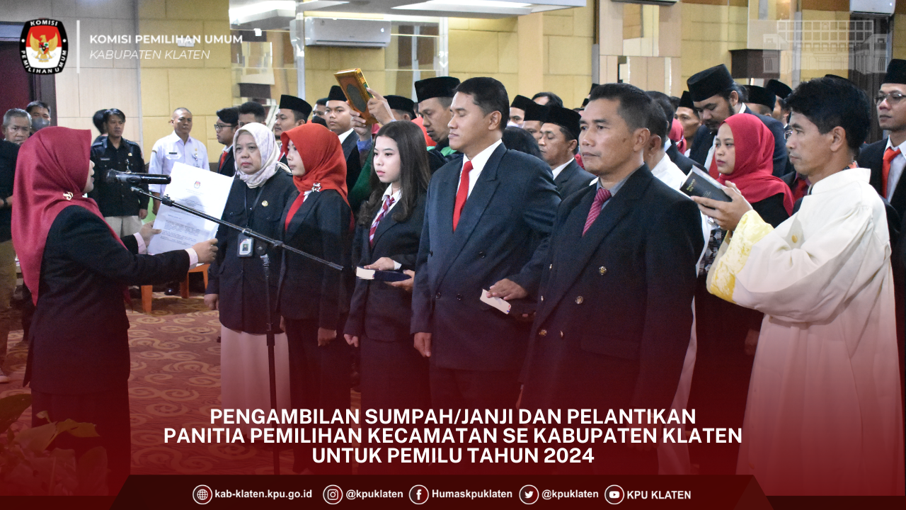 #TemanPemilih Klaten-Rabu (04/1), Komisi Pemilihan Umum Kabupaten Klaten menyelenggarakan Pengambilan Sumpah/Janji dan Pelantikan Pnitia Pemilihan Kecamatan Se Kabupaten Klaten Untuk Pemilu Tahun 2024, Kegiatan tersebut dihadiri oleh Wakil Bupati Bapak H. Yoga Hardaya, SH,MH., Ketua DPRD Bapak Hamenang Wajar Ismoyo, S.I.Kom, Dinas Instansi terkait, Ketua Bawaslu dan Seluruh Anggota PPK yang dilantik.