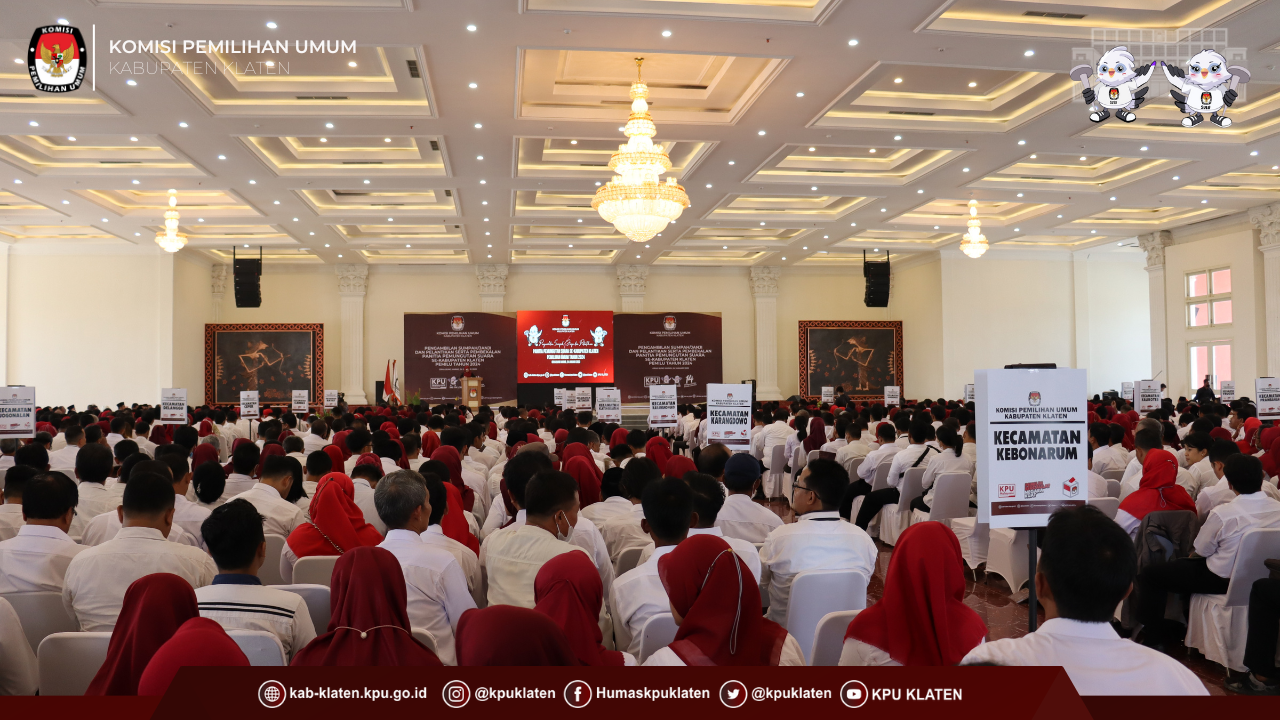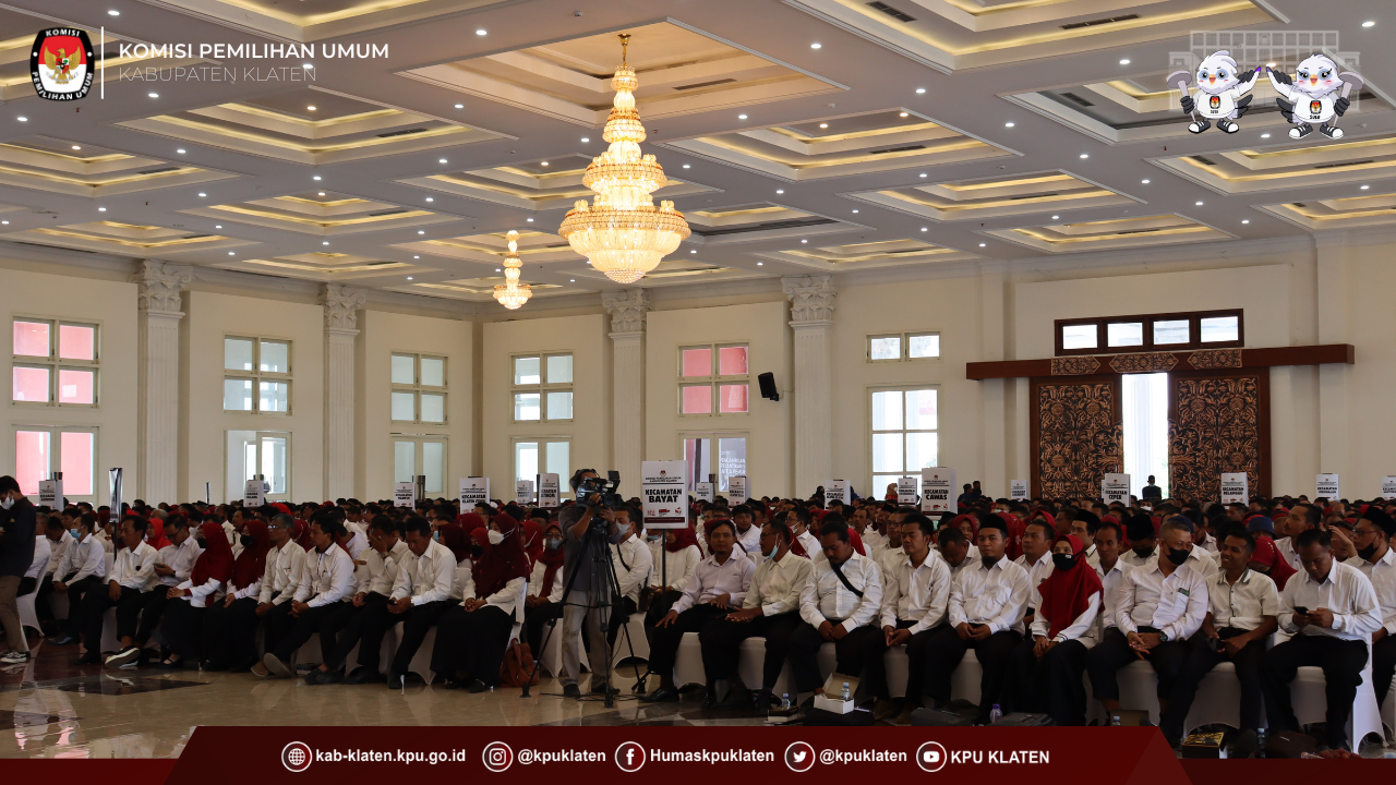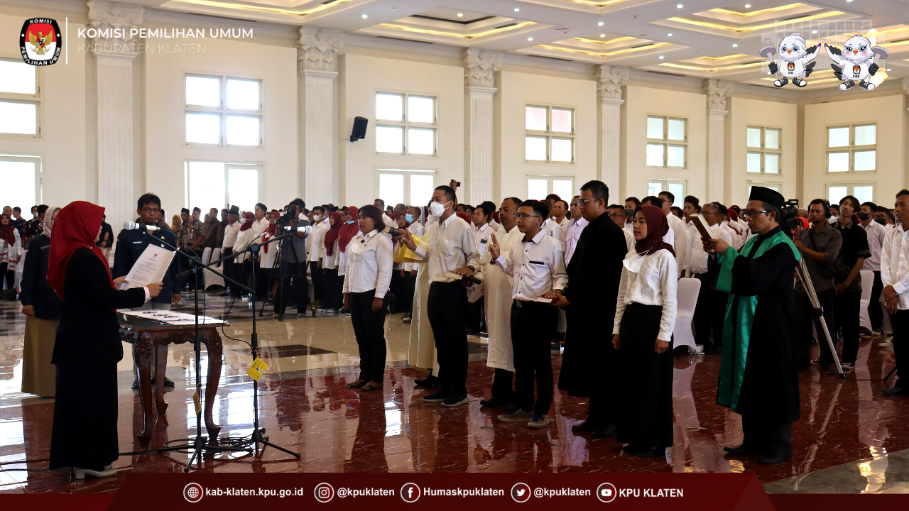 #TemanPemilih Klaten - Selasa (24/1) Komisi Pemilihan Umum Kabupaten Klaten menyelenggarakan kegiatan Pengambilan Sumpah/Janji dan Pelantikan Serta Pembekalan Panitia Pemungutan Suara (PPS) Pemilu Tahun 2024 yang diselenggarakan di Gedung Pertemuan Grha Bung Karno Klaten.
