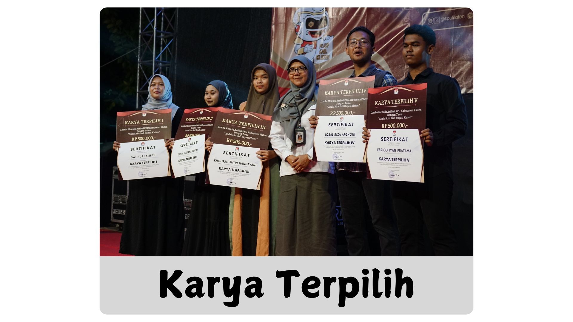 KLATEN - #TemanPemilih KPU Klaten memberikan penghargaan kepada pemenang Lomba KPU Menulis dengan tema Jika Aku Menjadi Bupati Klaten, Senin (25/11). Pemberian penghargaan ini diselenggarakan dalam rangkaian kegiatan KPU Bersholawat - Sosialisasi dan Do'a Bersama untuk Pemilihan Gubernur dan Wakil Gubernur Jawa Tengah serta Bupati dan Wakil Bupati Klaten Tahun 2024. Setidaknya ada tiga kategori pemenang, yaitu kategori Karya Terbaik, Karya Terfavorit, dan Karya Terpilih, dengan total hadiah sebesar Rp 8.500.000,-.