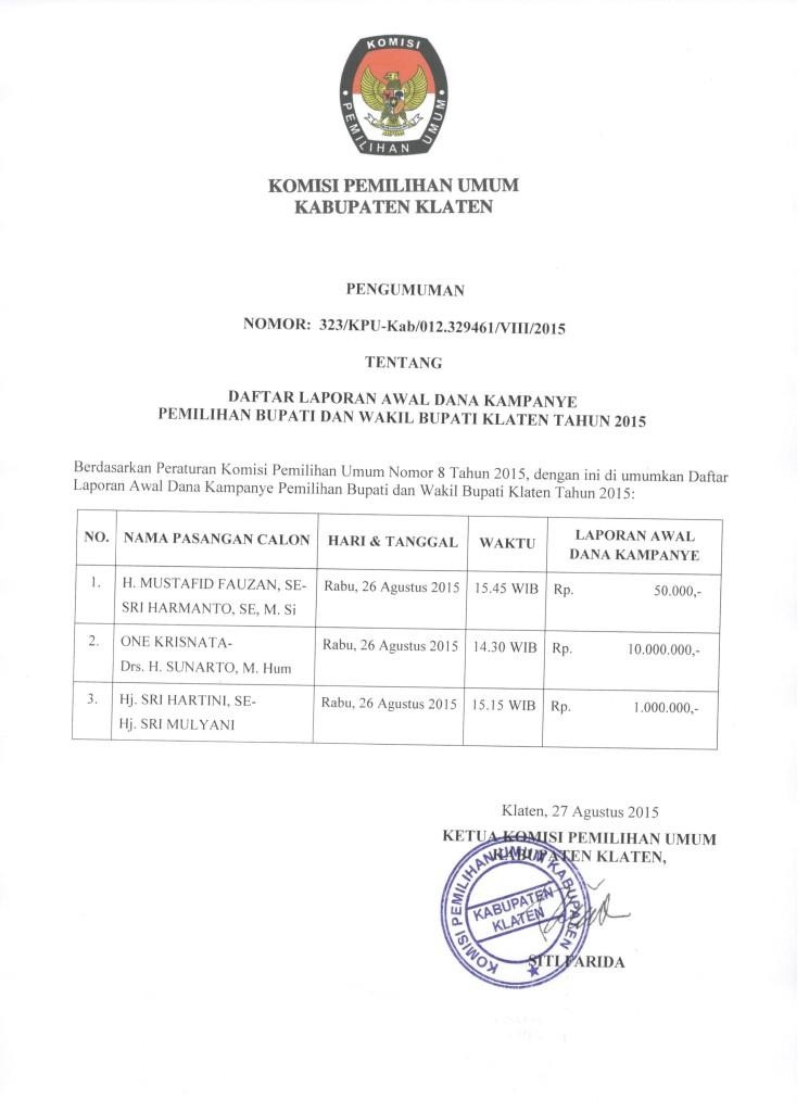 PENGUMUMAN DAFTAR LAPORAN AWAL DANA KAMPANYE PEMILIHAN BUPATI DAN WAKIL BUPATI KLATEN TAHUN 2015