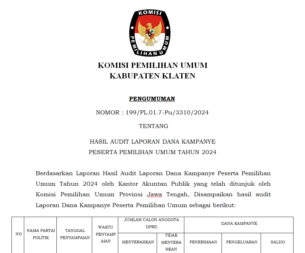 Pengumuman Hasil Audit Laporan Dana Kampanye Peserta Pemilu Tahun 2024 selengkapnya dapat dilihat Disini..