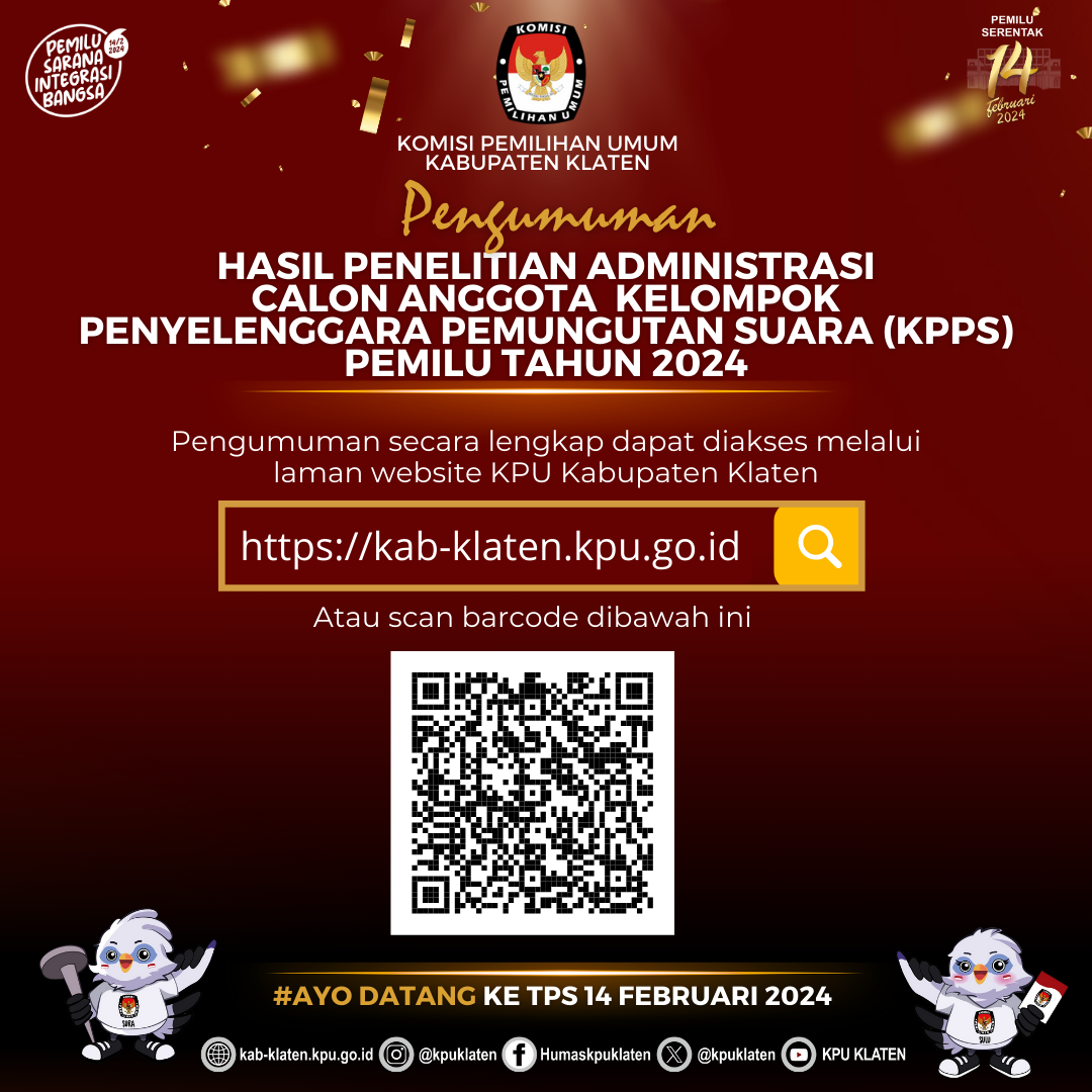 PENGUMUMAN HASIL PENELITIAN ADMINISTRASI CALON ANGGOTA KPPS PEMILU TAHUN 2024 SE KABUPATEN KLATEN
