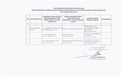 PENGUMUMAN PENETAPAN KANTOR AKUNTAN PUBLIK (KAP) AUDIT LAPORAN DANA KAMPANYE PEMILIHAN BUPATI DAN WAKIL BUPATI KLATEN TAHUN 2015