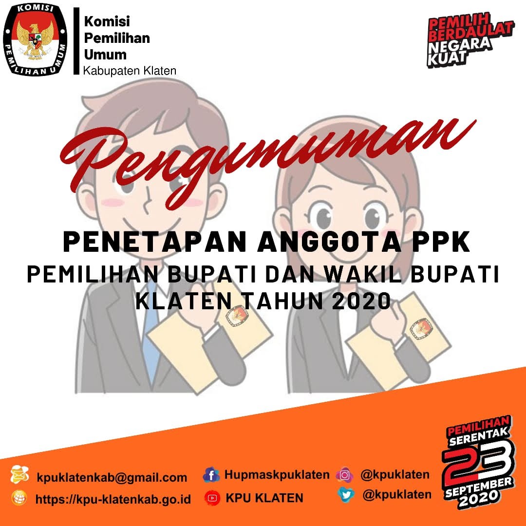 KLATEN – Berdasarkan Hasil Klarifikasi Tanggapan Masyarakat atas Pengumuman Hasil Seleksi Wawancara Calon Anggota (PPK) Tepilih Pemilihan Bupati dan Wakil Bupati Klaten Tahun 2020, diumumkan nama-nama Anggota PPK Terpilih Pasca Tanggapan masyarakat sebagaimana terlampir dalam Pengumuman Penetapan Panitia Pemilihan Kecamatan, yang dapat dilihat dan diunduh [DISINI]
