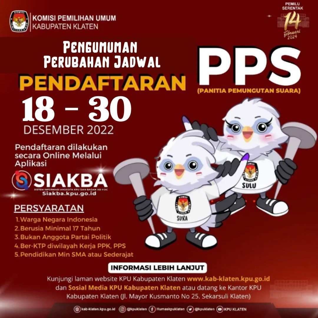 KLATEN - Sehubungan dengan terbitnya Keputusan KPU Nomor 534 Tahun 2022 tentang perubahan atas Keputusan KPU Nomor 476 Tahun 2022 tentang Pedoman Teknis Pembentukan Badan Ad-Hoc Penyelenggara Pemilihan Umum dan Pemilihan Gubernur dan Wakil Gubernur, Bupati dan Wakil Bupati, Walikota dan Wakil Walikota yang mengatur mengenai perubahan jadwal pembentukan PPS. maka disampaikan: