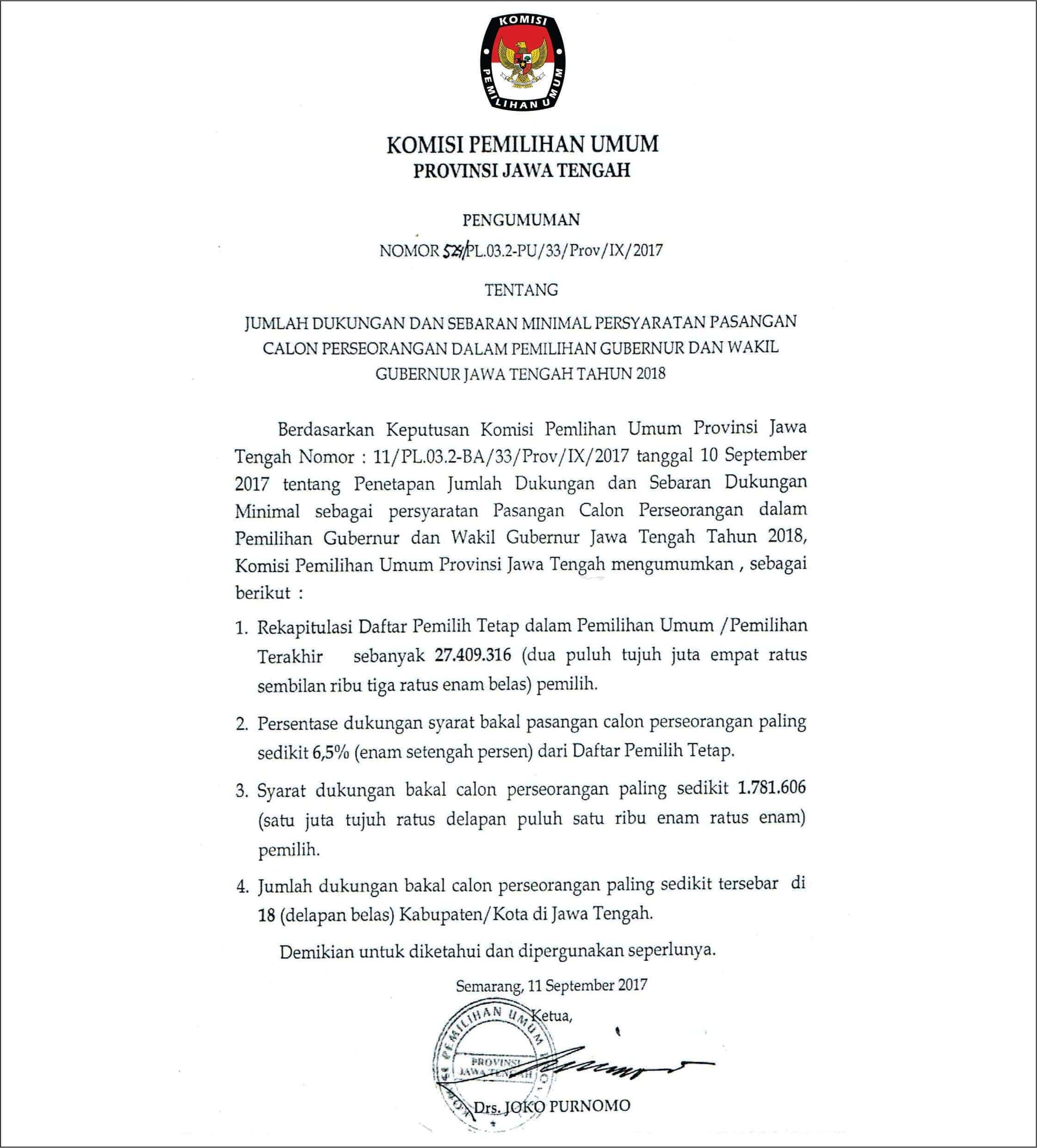 PENGUMUMAN TENTANG JUMLAH DUKUNGAN DAN SEBARAN MINIMAL PERSYARATAN PASANGAN CALON PERSEORANGAN DALAM PILGUB JATENG 2018