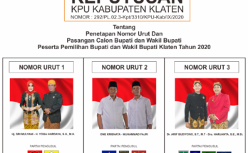 Komisi Pemilihan Umum Kabupaten Klaten menetapkan Nomor Urut Pasangan Calon Bupati dan Wakil Bupati Peserta Pemilihan Bupati dan Wakil Bupati Klaten Tahun 2020 yang dituangkan dalam Keputusan KPU Kabupaten Klaten Nomor 292/PL.02.3-Kpt/3310/KPU-Kab/IX/2020 Tentang Penetapan Nomor Urut Pasangan Calon Bupati dan Wakil Bupati Peserta Pemilihan Bupati dan Wakil Bupati Klaten Tahun 2020.