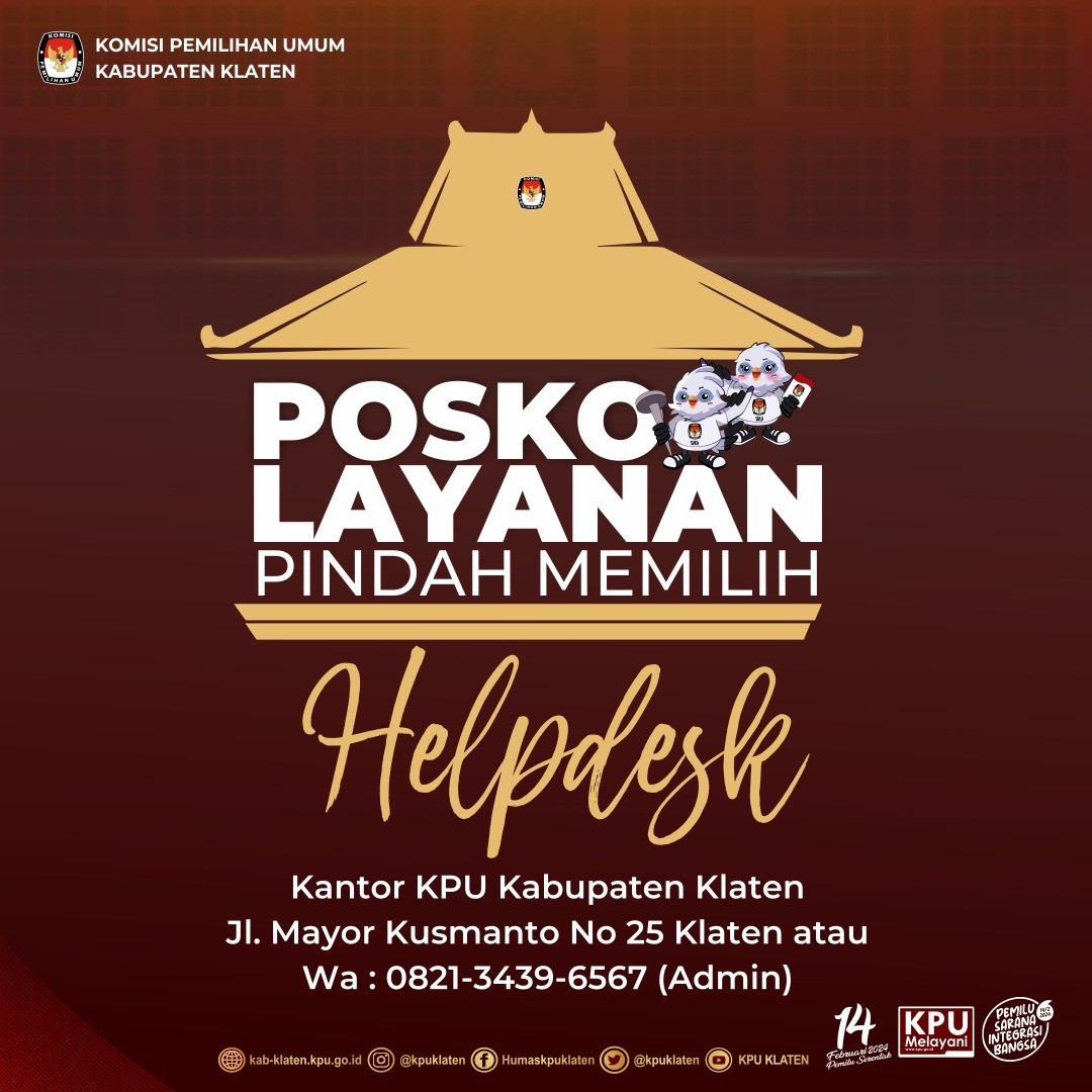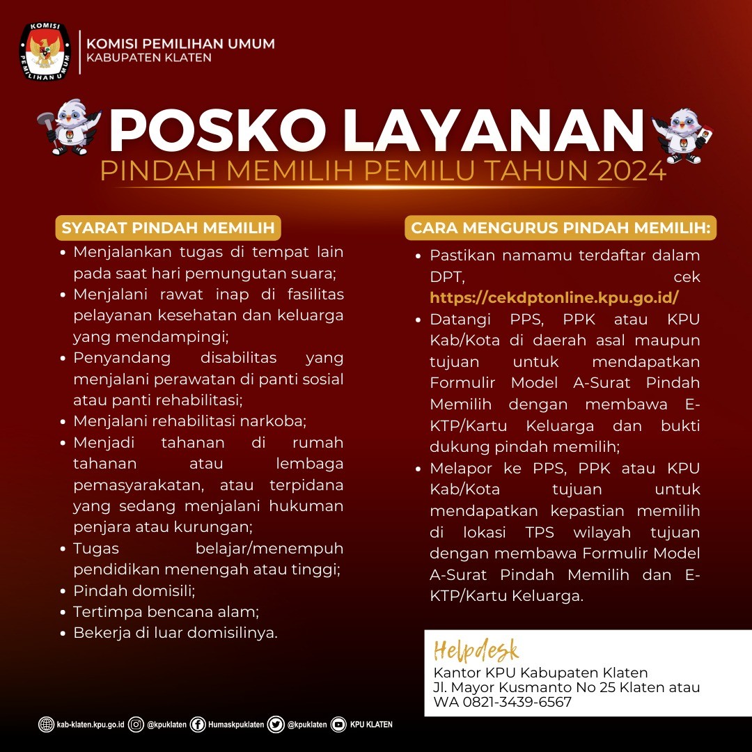 #TemanPemilih Posko Layanan Pindah Memilih Pemilu Tahun 2024 dapat dikunjungi di Kantor KPU Kabupaten Klaten, PPK dan PPS pada Hari Senin s.d. Jumat (08.00 WIB - 16.00 WIB).