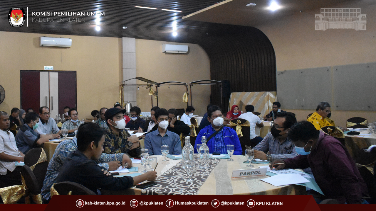 Sebagai narasumber dalam kegiatan tersebut Ketua Divisi Teknis Penyelenggaraan bapak Samsul Huda, S.H.I, Ketua Divisi Perencanaan Data dan Informasi Bapak Syamsul Ma'arif, S Pd.I. dan Operator Sipol KPU Kabupaten Klaten.