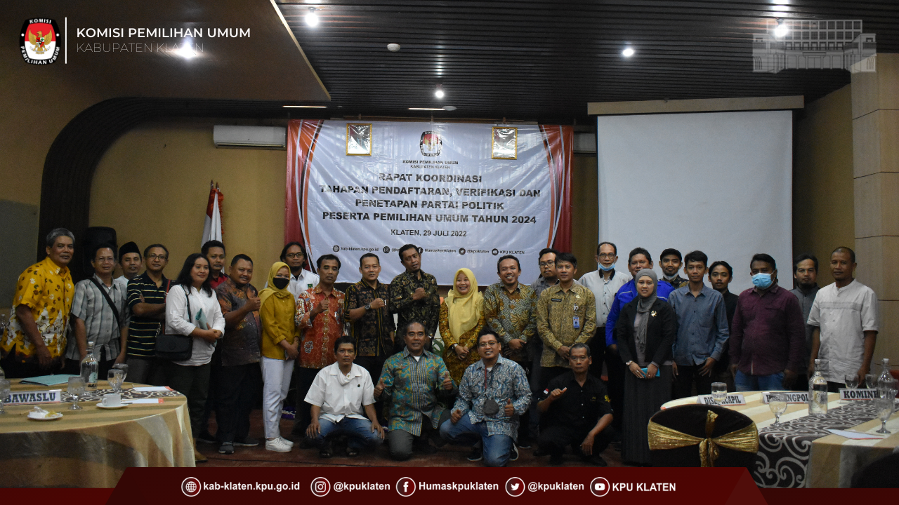 #TemanPemilih Jumat (29/7), KPU Kabupaten Klaten menggelar Kegiatan Rapat Koordinasi Tahapan Pendafataran, Verifikasi dan Penetapan Partai Politik Calon Peserta Pemilu 2024. Dalam kegiatan tersebut KPU Kabupaten Klaten mengundang Bawaslu, Diskominfo,Badan Kesbangpol, Disdukcapil, dan Ketua beserta Operator Sipol Partai Politik Calon Peserta Pemilu 2024.